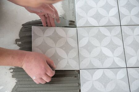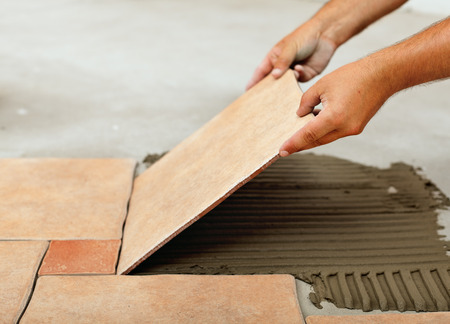 Installing ceramic floor tiles - placing the tile into the adhesive material bedding, closeup