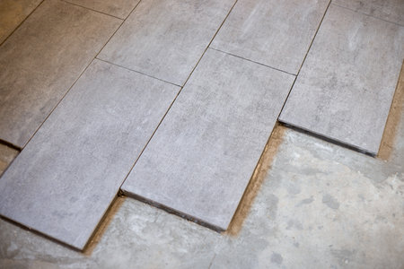 A worker is shown installing large ceramic tiles on a floor surface. The image captures the installation process, focusing on the hands using tools to apply adhesive and position the tiles. The scene takes place indoors, under bright lighting, highlighting the modern style. Suitable for commercial projects focused on construction and home improvement.