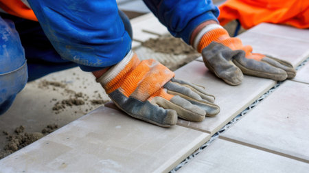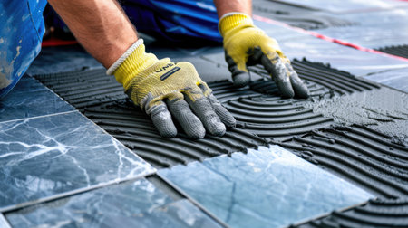 A construction worker skillfully installs floor tiles on a building site, wearing protective gloves and carefully aligning each piece for a flawless finish.