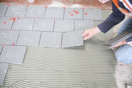 Professional construction worker carefully laying ceramic floor tiles using cement adhesive, showcasing precise tiling technique in interior renovation project