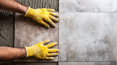 Hands adorned in yellow gloves carefully place ceramic tiles on a concrete wall, showing skilled craftsmanship and meticulous attention to detail.