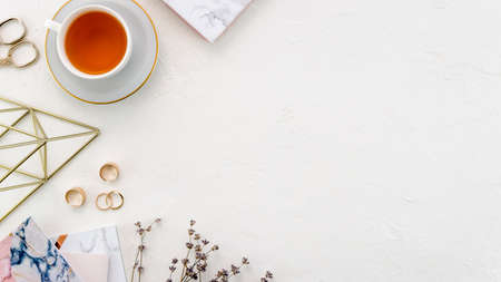 Top view of modern photographer workplace with laptop computer, cup of tea and office supplies on white desk background