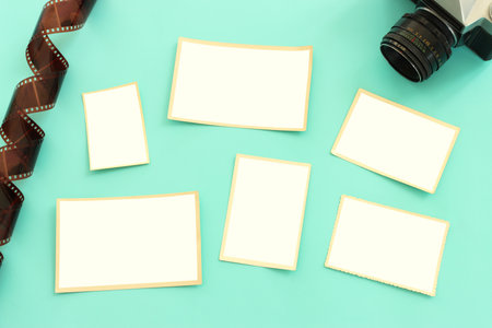 Blank photos on a yellow background. The concept of preserving memories. Flat lay. Copy space. Banner.