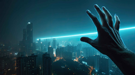 A captivating urban scene featuring a hand reaching out towards a vibrant light beam. The atmospheric cityscape combines elements of technology and creativity.