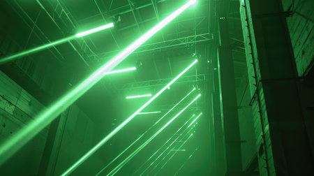 From below shot of bright beams of green laser lights illuminating music venue during show