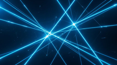 An abstract composition of intersecting bright blue laser lines forming a network against a dark, speckled background.
