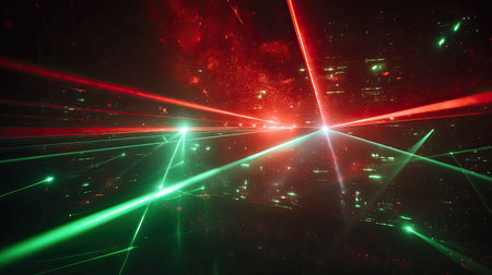 A captivating display of vibrant laser beams in red and green colors, creating dynamic patterns. Perfect for projects related to technology and nightlife.