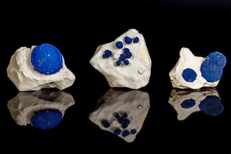 macro photography of sample of natural mineral from geological collection - unpolished Azurite mineral crystals from Jezkazgan, Kazakhstan on black granite background