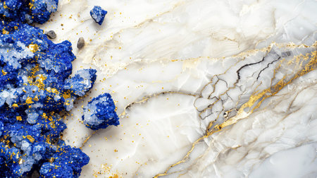 Close-up of blue and gold mineral crystals on a marble surface, showcasing natural textures and vibrant colors.