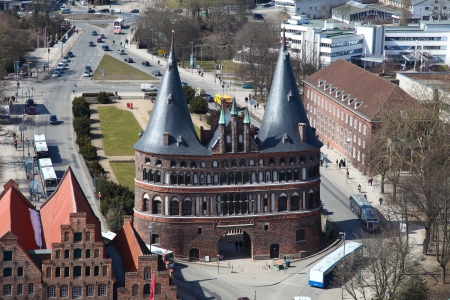 Aerial view on the Holsten Gate (Holstein Tor, later Holstentor), a city gate marking off the western boundary of the old center of the Hanseatic city of Lubeck, Schleswig-Holstein, Germany.