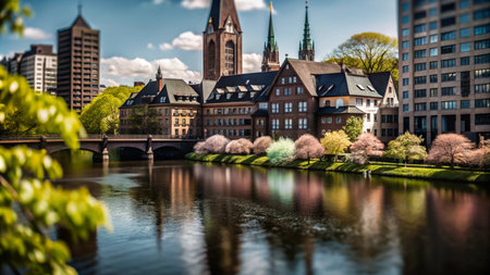 A picturesque cityscape with a river flowing through it, lined with cherry blossom trees in full bloom. The sun shines brightly in the background, casting a warm glow over the scene.