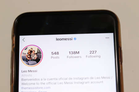 Los Angeles, California, USA - 18 December 2019: Leo Messi profile on Instagram on phone screen close-up, Illustrative Editorial.