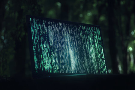 Displaying green code cascade on monitor in dimly lit room, with neon-green arc and binary 0011001. Cybersecurity, data visualization, futuristic, digital interface, high-tech, encryption, computer science