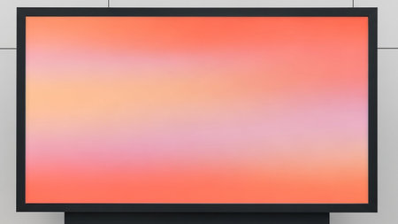 A wide, rectangular digital screen exhibits a soft, smooth gradient transitioning from a warm peach and orange at the bottom to a delicate pink and lighter orange at the colors blend seamlessly, creating an abstract and visually pleasing effect. The screen is framed by a dark border, and it appears to be mounted on a dark base, suggesting a modern display unit. The background is out of focus, emphasizing the screen's colors.
