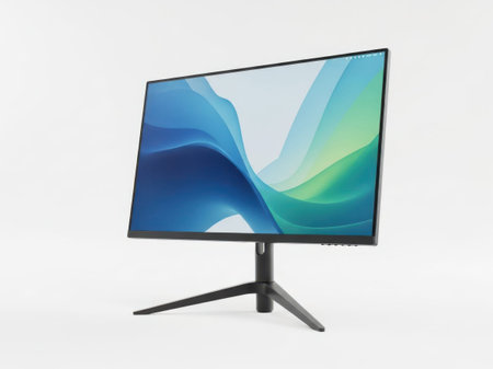This image features a sleek, modern computer monitor with a vibrant display showcasing blue and green abstract waves. The monitor is mounted on a stylish stand and is isolated on a clean, white background, making it the focal point of the image. The design is contemporary, emphasizing clarity and high-definition visuals.