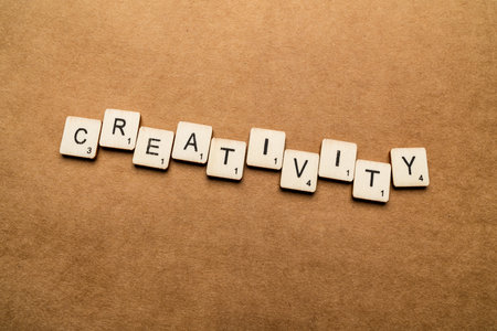 LONDON, UK - May 24 2019: The word CREATIVITY, spelt with wooden letter tiles over a brown textured background