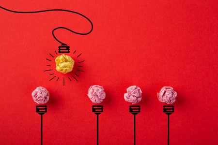 Inspiration concept crumpled paper light bulb metaphor for good idea on red background