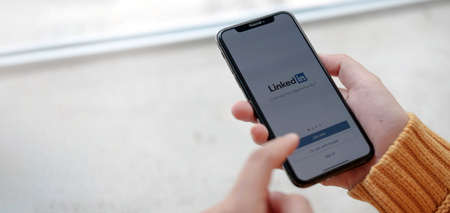 CHIANG MAI, THAILAND, DEC 12, 2020 : A women holds Apple iPhone Xs with LinkedIn application on the screen.LinkedIn is a photo-sharing app for smartphones.