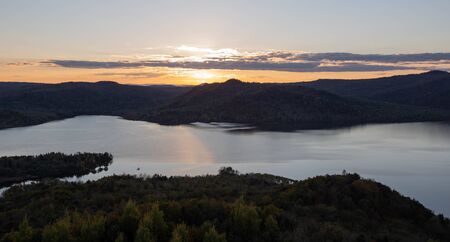 Aerial view of beautiful Lake Tremblant at sunset with colorful autumn foliage covering the mountains from the summit of Mont Tremblant, Quebec, Canada