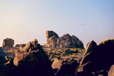 Beautiful and wild rocky coast of France in vintage retro tones, vintage landscape of coastline of France.