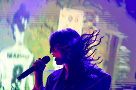 A singer captures the audience's attention with a unique style under vibrant stage lighting during a live concert.