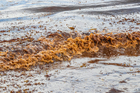 A lot of very disgusting and dirty Caribbean beach water with seaweed sargazo in Playa del Carmen Quintana Roo Mexico.