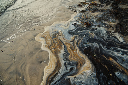 dirty water with oil on a beach, water pollution