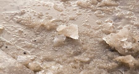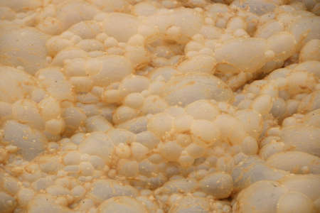 Foamy muddy water of yellowish-brown color. Muddy sea water, puddle, dirty surface Top view.