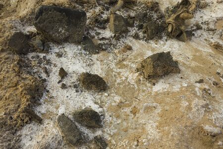 Deposits of salt and therapeutic mud in the lagoons of salty pink lake. Healing springs for health and beauty. Selective focus, copy space.