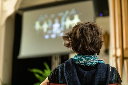 Closeup of woman wearing blue scarf and sweater sitting on chair and looking at projector during world and spoken word event in auditorium hall