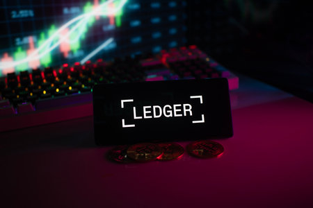 Dhaka, Bangladesh 18 September 2025:LEDGER logo with coins and trading charts, highlighted by neon-illuminated background