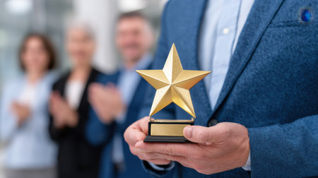 A stunning golden star trophy is showcased prominently, symbolizing achievement and success, while people in the background applaud, celebrating a moment of victory in a professional setting.