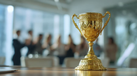 Golden trophy on a desk with blurred background people celebrating achievements and success during award event in a modern office environment.