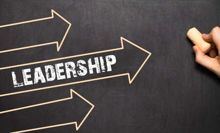 Text leadership in uppercase on paper with arrows to associated qualities, empower people, inspire, lead change and shared vision on wood table. Business and success concept.