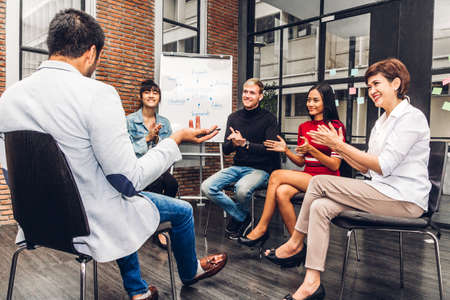 Group of professional business meeting and discussing strategy with new startup project.Creative business people planning and brainstorm with document report in modern workloft.Teamwork concept