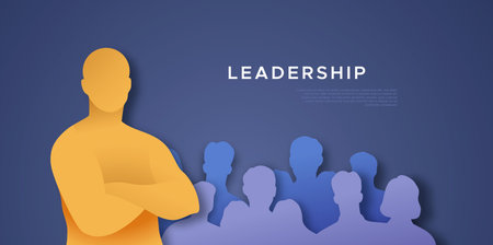 Man with arms crossed in front of people crowd. 3D papercut business illustration, leadership template. Male team leader standing confident at office work space.