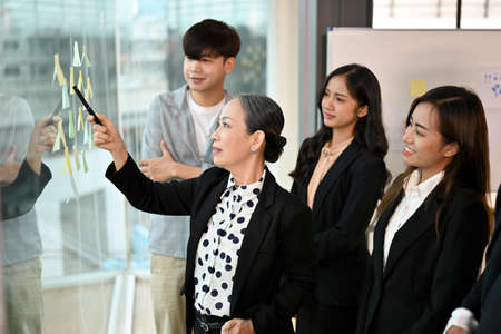 Intelligent Asian senior female executive manager or female boss coaching and leading business training to her millennial team.