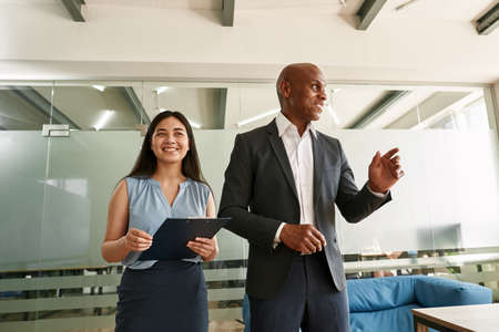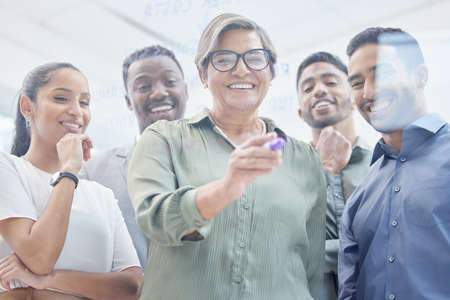 Smiling business woman team leader explaining strategy to diverse business people at briefing.