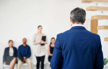 Horizontal shot of professional psychologist standing in front of clients planning next stages for speaking about depression and its treatment