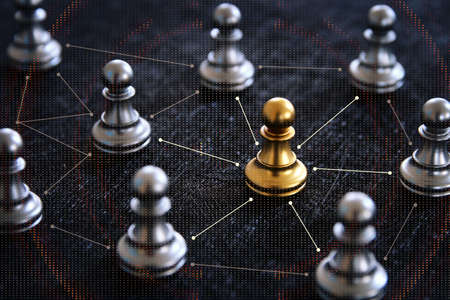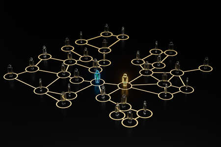 3D illustration of pawns linked together by many golden lines over black background. Social connections concept.