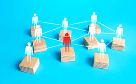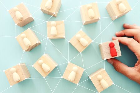 Black lines connect the leader to the pictogram of people on wooden cubes. concepts of team building, business management, or the concepts of human resources and organization.