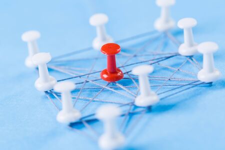 Small network of pins (Thumbtack)and string, An arrangement of colorful pins linked together with string on a pale blue background suggesting a network of connections.