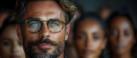 Portrait of senior man in eyeglasses looking at camera with diverse friends in background