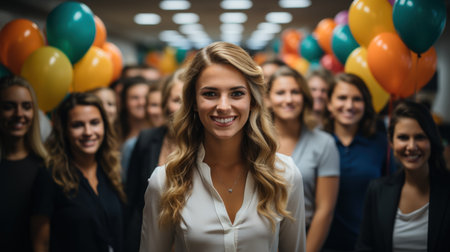 A joyful woman stands at the forefront, beaming with happiness as her colleagues applaud her achievements in a bright, modern office. This uplifting moment captures the essence of teamwork and celebration, showcasing camaraderie and support among peers