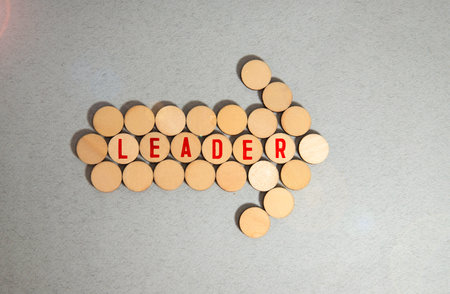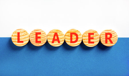 Leadership and leader symbol. Concept word Leader on beautiful wooden circles. Beautiful blue and white background. Business leader and leadership concept. Copy space.