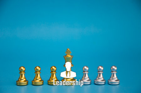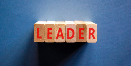 Leadership and leader symbol. Concept word Leader on beautiful wooden blocks. Beautiful blue background. Business leader and leadership concept. Copy space.