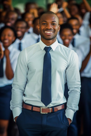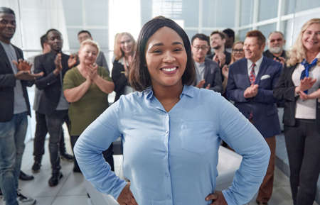 Portrait of young smiling African American businessman standing confidently in front of the team cheering. Leadership concept. High quality photo