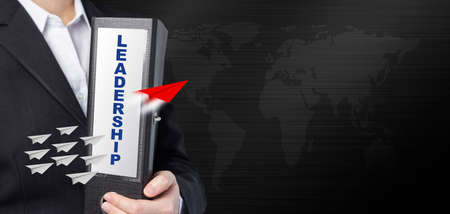 Leadership concept of business woman holding document file with paper planes
