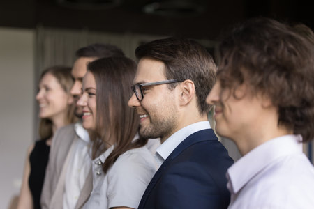 Group of smiling businesspeople, five successful teammates stand in row, look forward. Career growth and ambitions, office department photoshoot for corporate photo, side profile faces view. Business