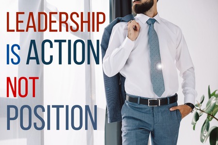 cropped view of businessman holding jacket and standing near window with leadership is action not position lettering